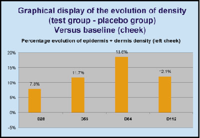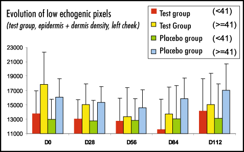 Within 2 months the older group shows a skin rejuvenation level of about 20 years, based on the epidemis + dermis density.